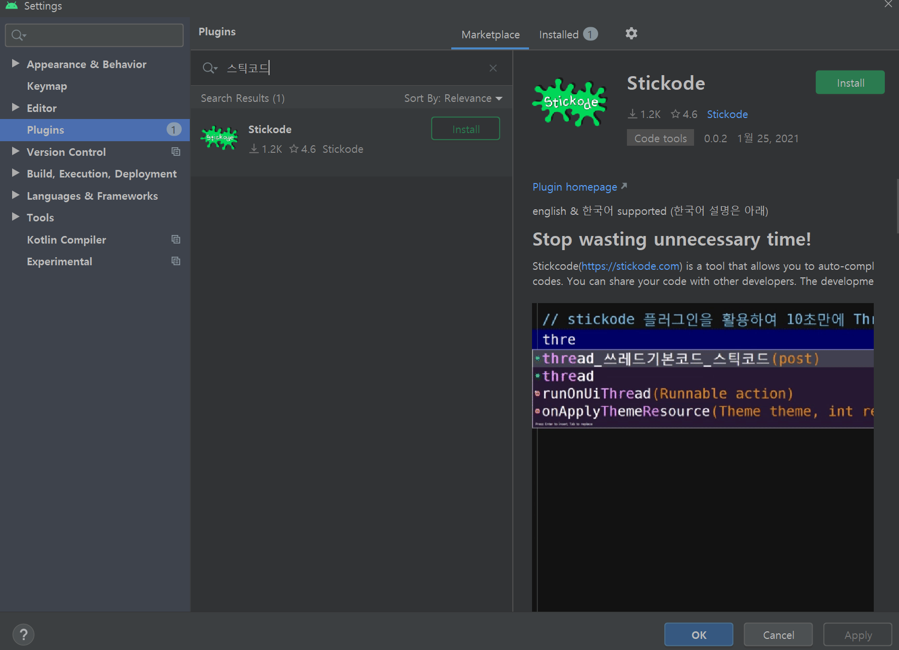 2. 안드로이드 스튜디오 스틱코드 plug-in 설치