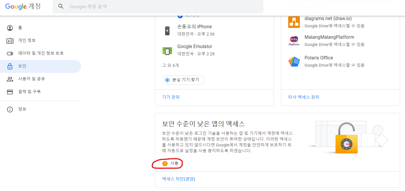 사용 전) 구글 계정 보안 수준 하향