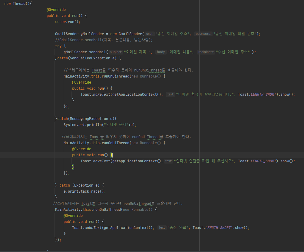 이메일 송신의 경우, 네트워크 통신이 필요해 별도 Thread 에서 실행하였습니다.