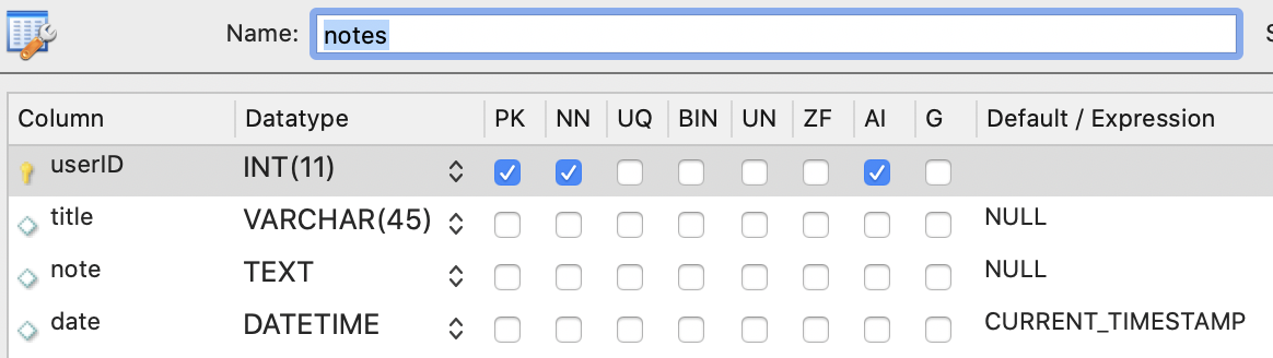 mysqlDB에 notes라는 이름의 Table을 만듭니다.