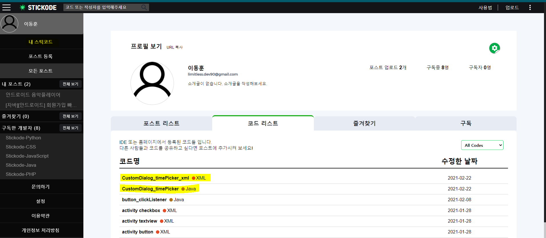 코드 리스트에 보면 업로드한 코드를 확인할 수 있습니다.