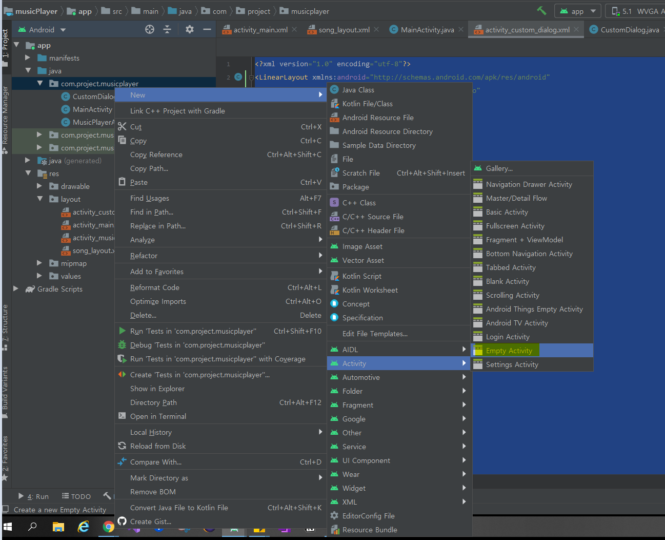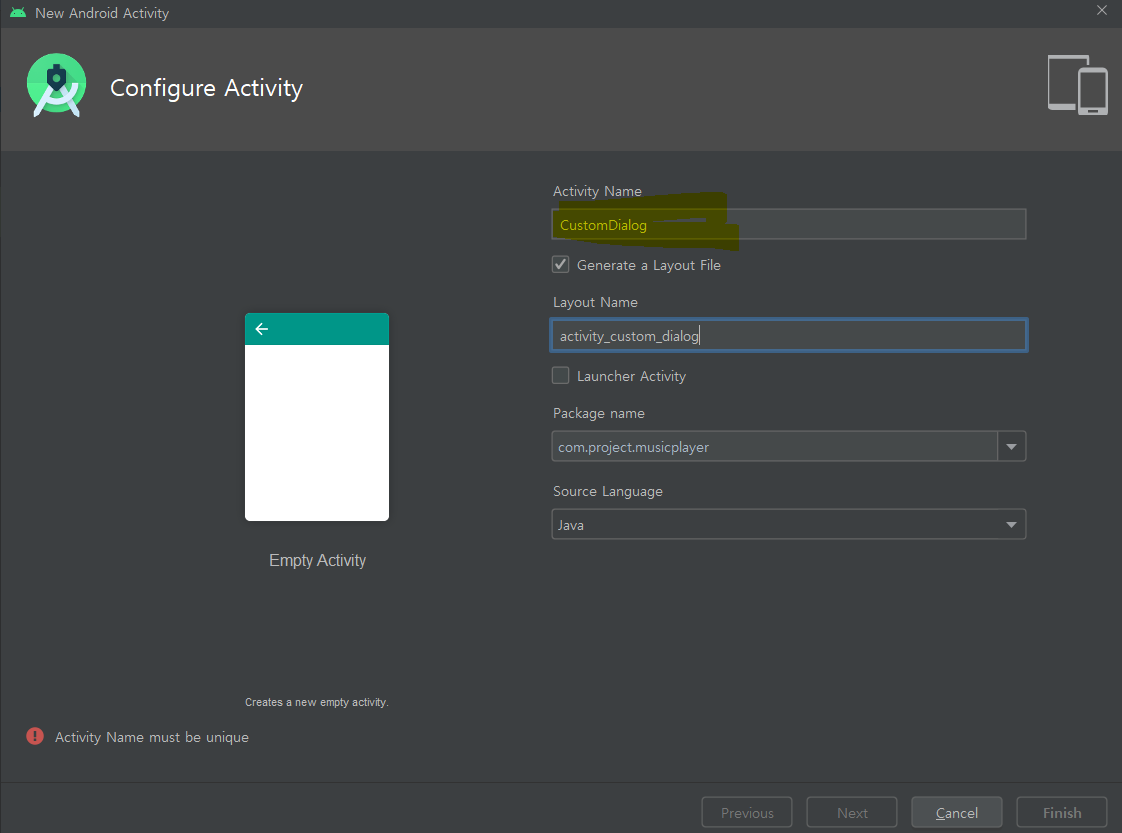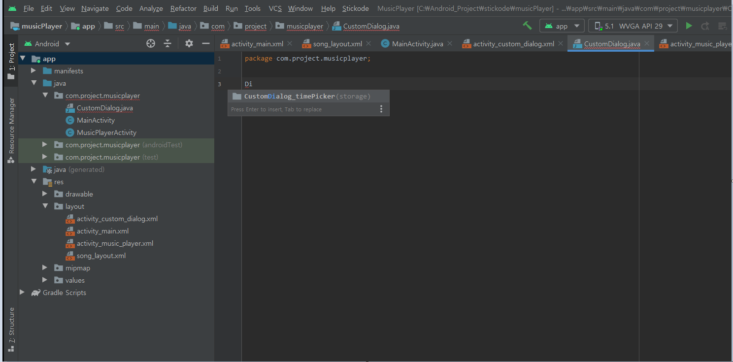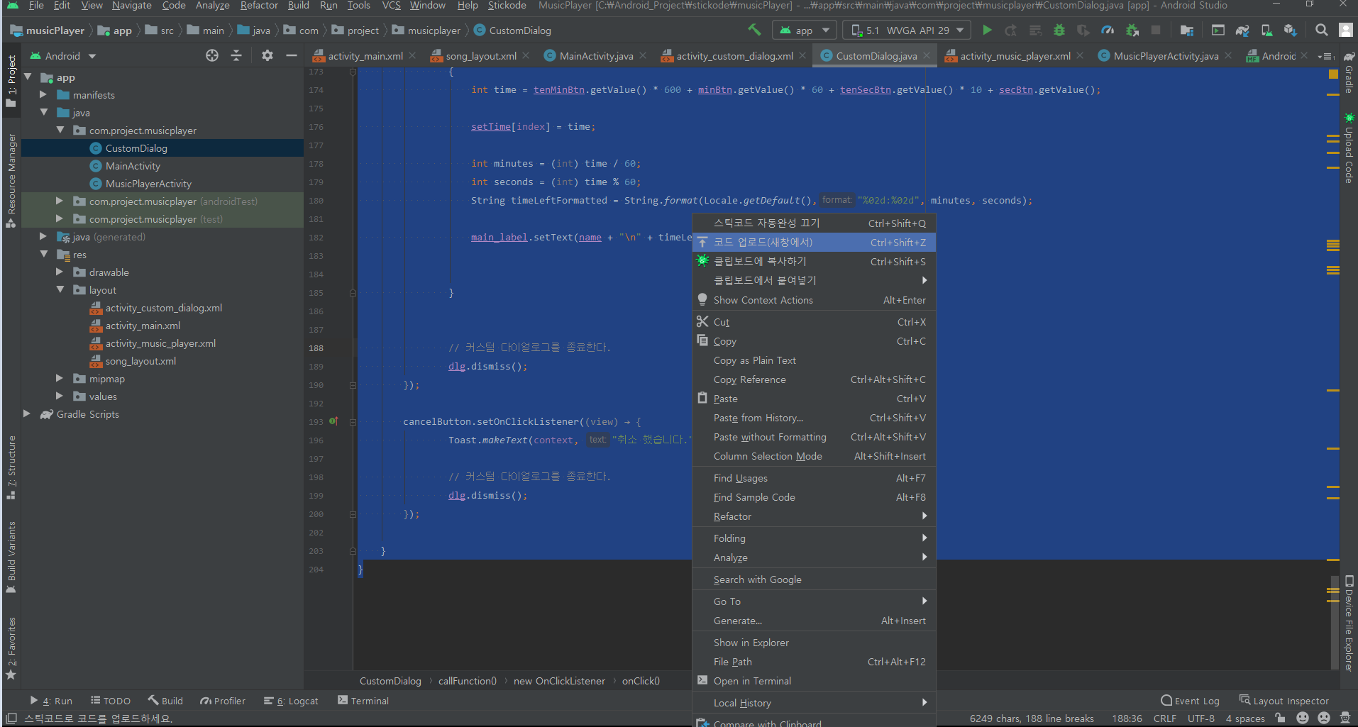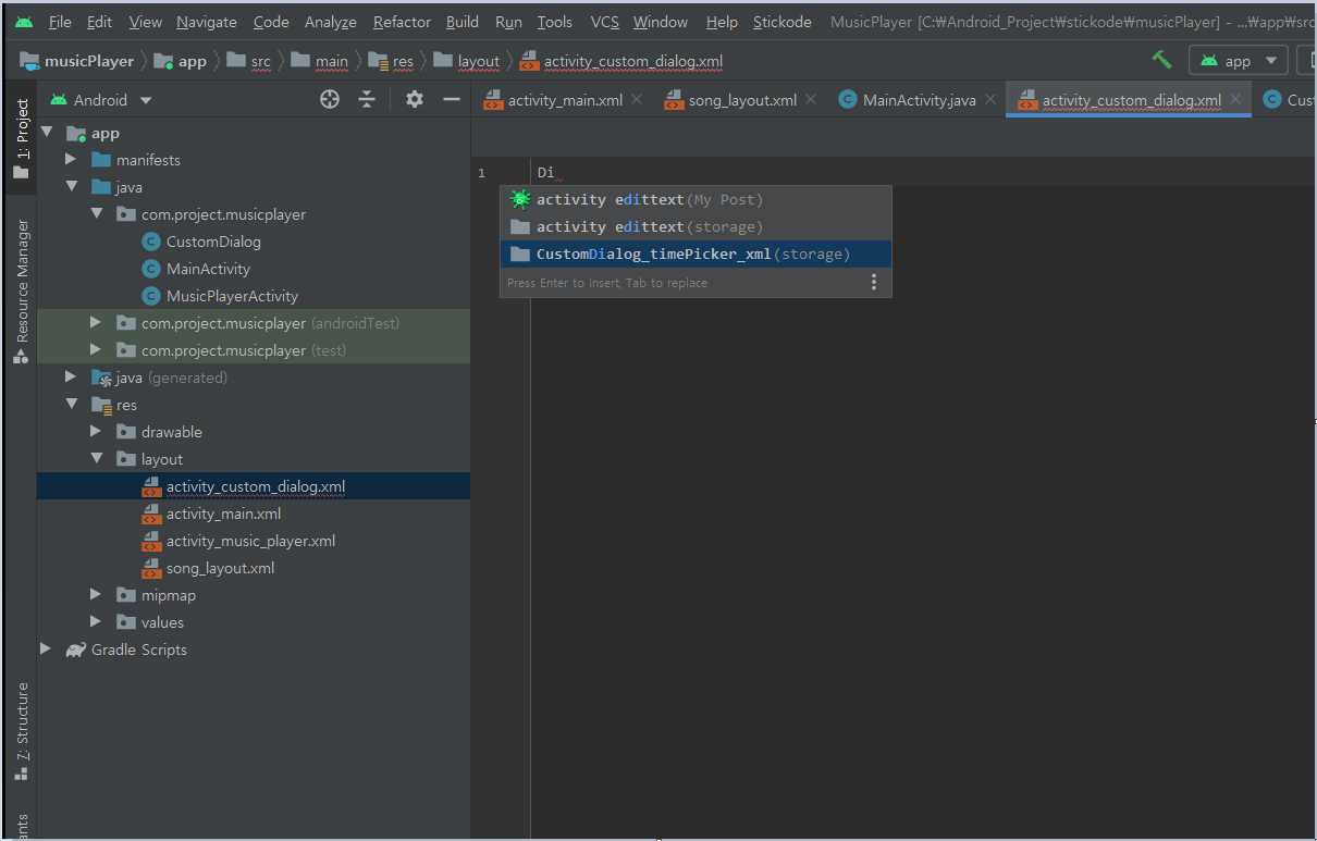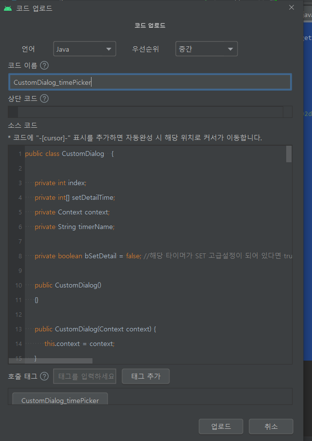 위와 같은 방법으로 커스텀 다이얼로그의 java 파일과 xml 파일을 업로드한다.