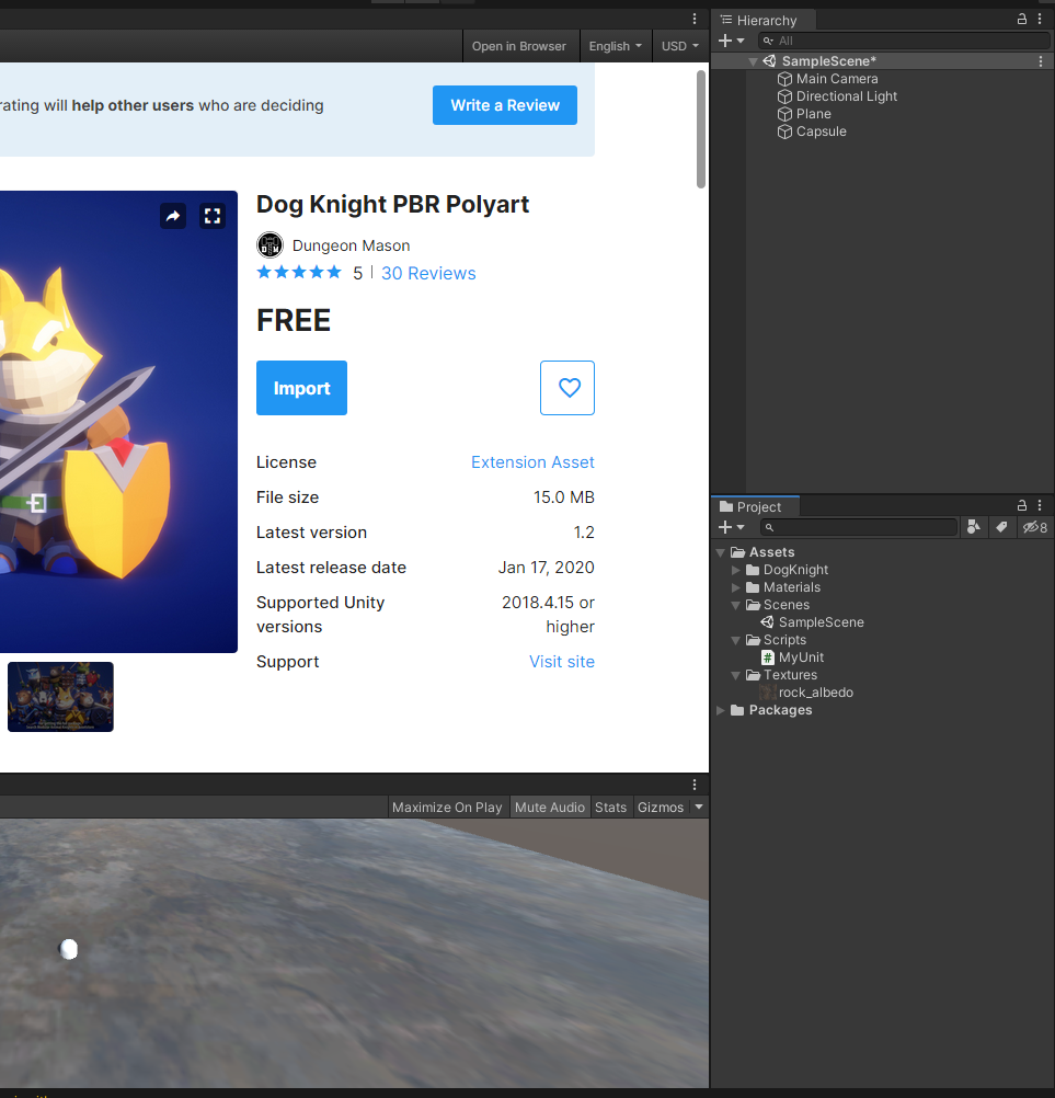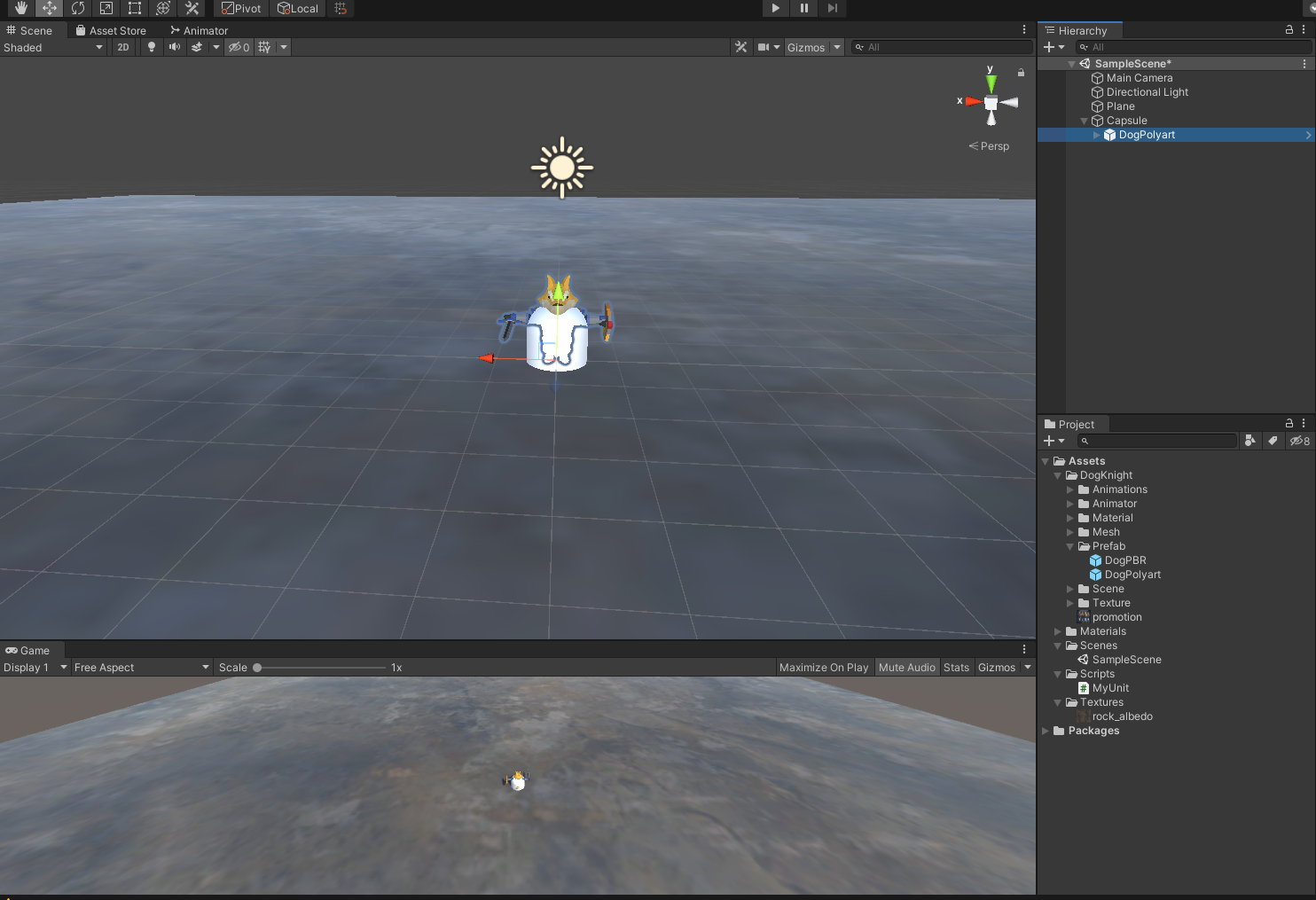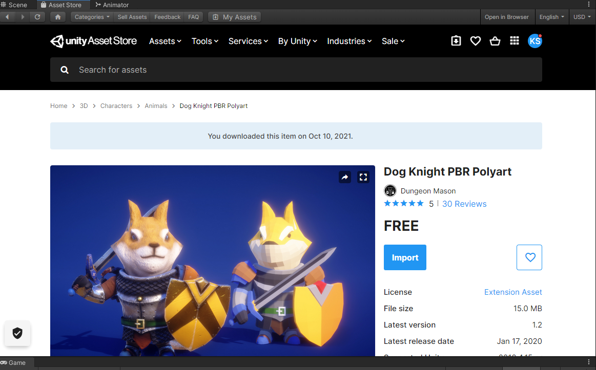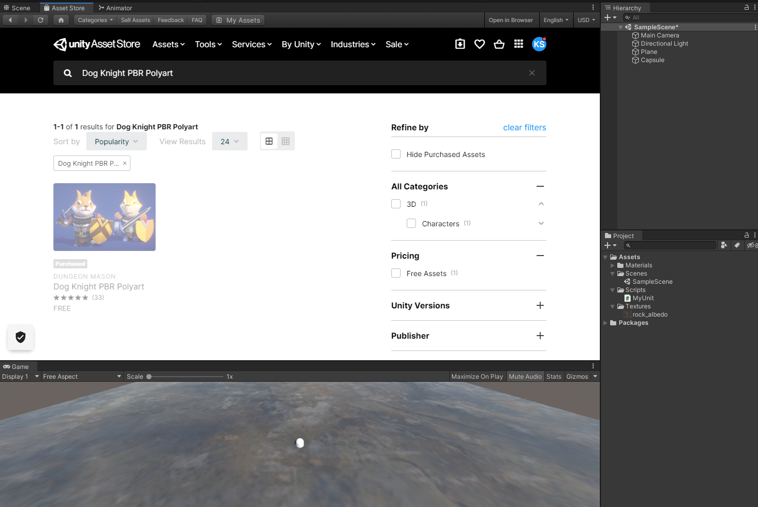 왼쪽 위 Scene 오른쪽 탭인 Asset Store 를 선택하신 후 검색창에 Dog Knight PBR Polyart 를 검색해주세요.