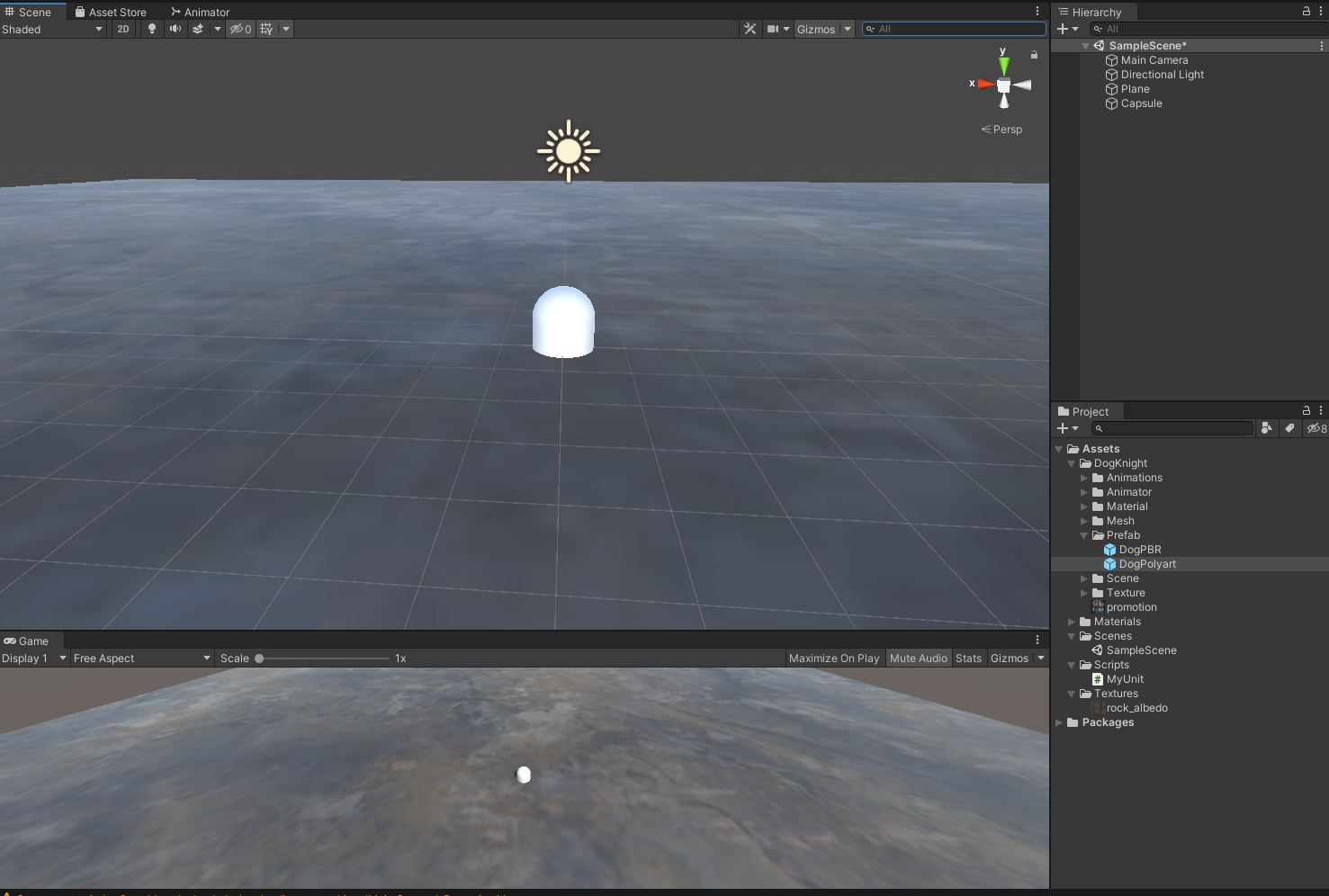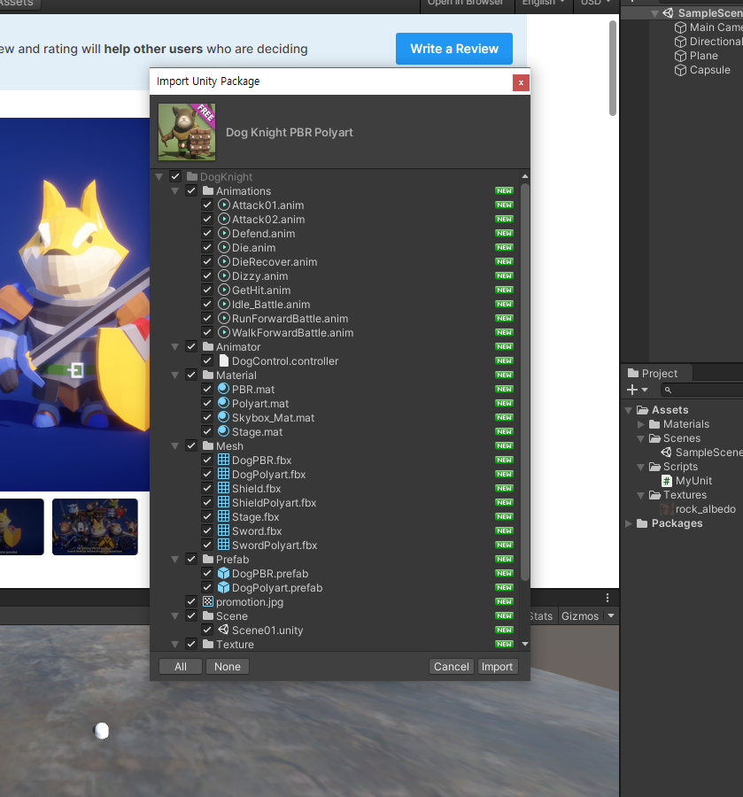 Asset Store 창을 Scene 창으로 바꾸고 DogPolyart 파일을 Capsule 로 드래그 앤 드롭해줍니다.
