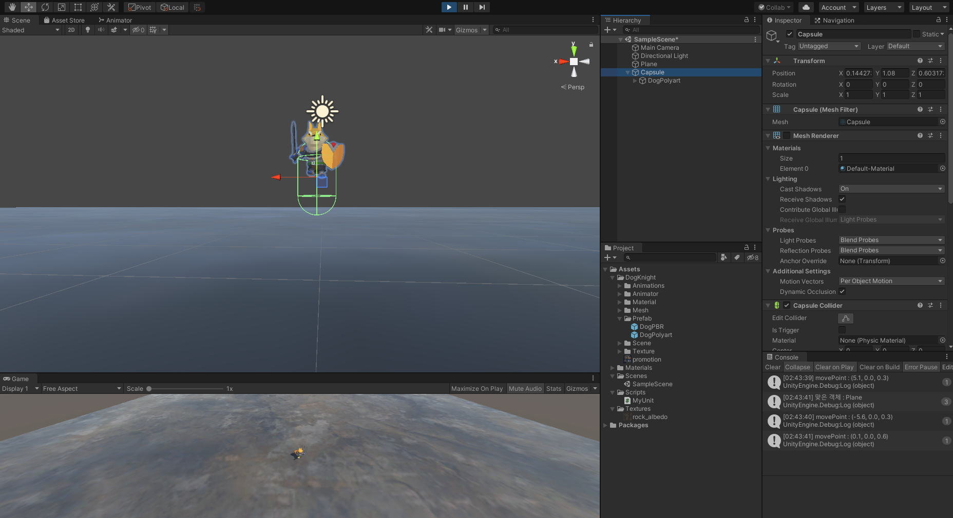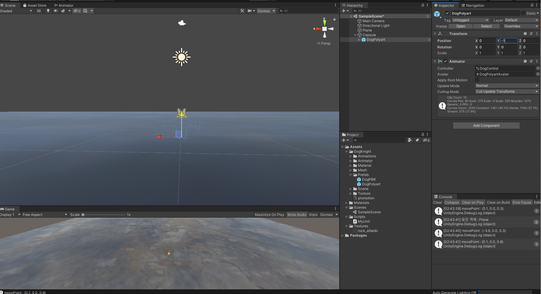 게임을 종료하신 후 Capsule 아래에 있는 DogPolyart 오브젝트의 Position Y 값을 -1 로 바꾸도록 합니다.