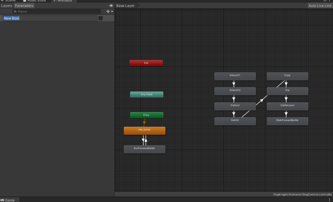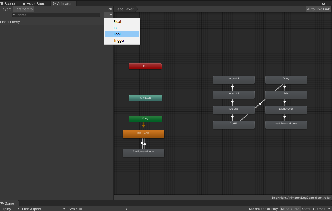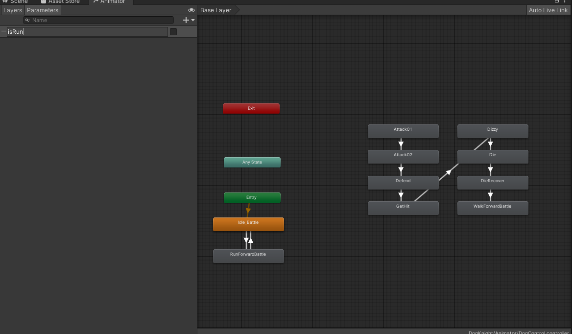 설정은 아래 오른쪽 화면과 같이 바꿔주세요. Idel_Battle 에서 RunForwardBattle 로 화살표를 추가하는 방법은 Idel_Battle 에서 우클릭 후 Make Transition 클릭, RunFrowardBattle 을 클릭하시면 됩니다. 삭제는 화살표를 클릭 후 키보드 Del를 누르시면 됩니다.
