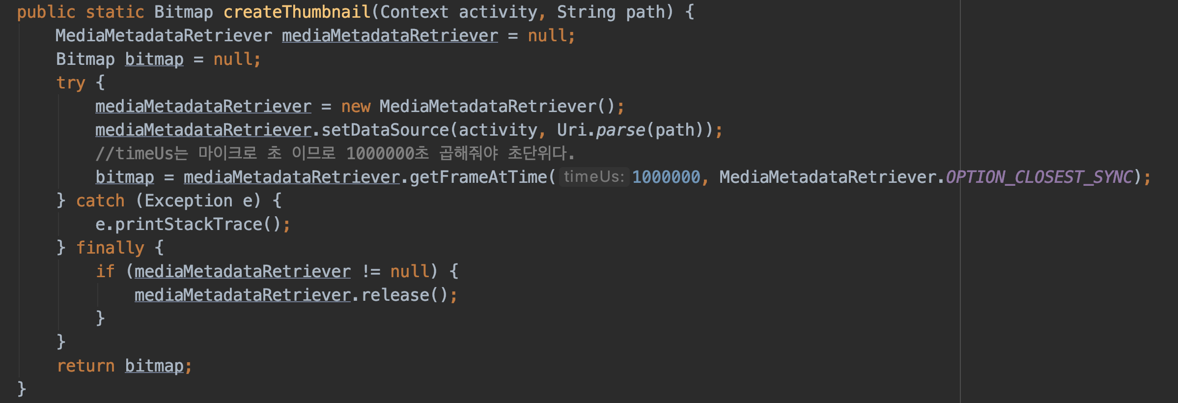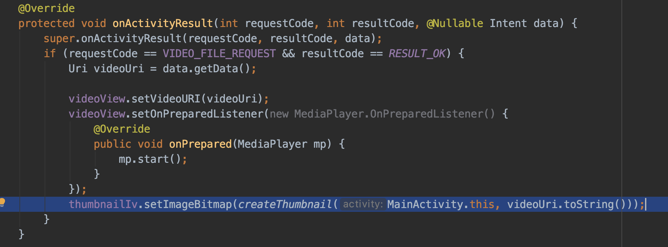 여기까지 했다면, 동영상 uri를 받아왔던 onActivityResult 메소드 안에 아래 코드를 삽입해준다.