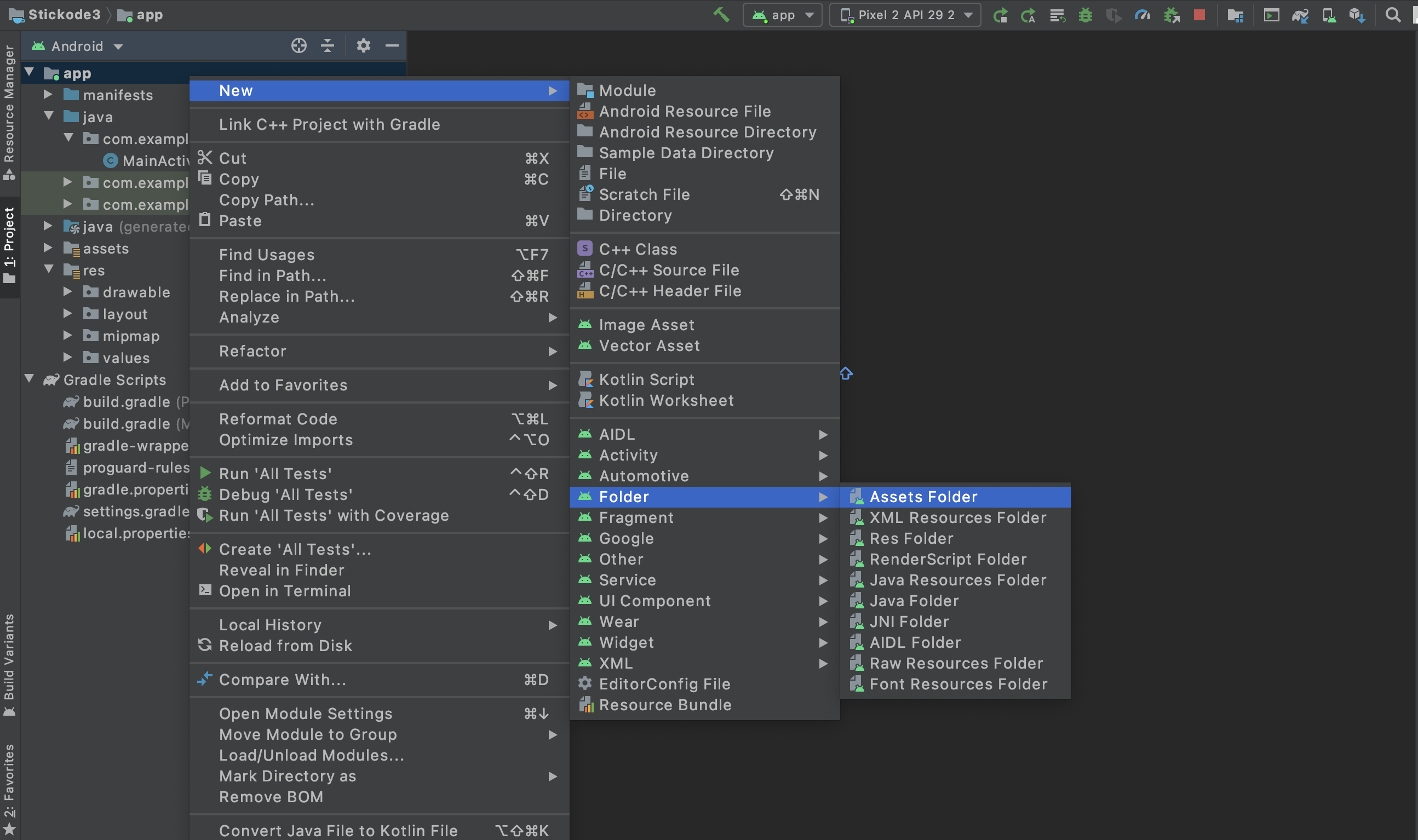 app 폴더의 오른쪽을 눌러 New -> Folder -> Assets Folder를 눌러 생성해줍니다.