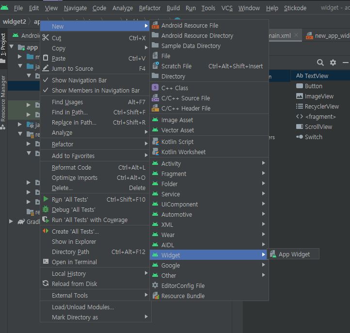 프로젝트 화면 - app 클릭 - 마우스 오른쪽 메뉴 - New - Widget - App Widget 을 클릭하면 기본 위젯이 생성됩니다.