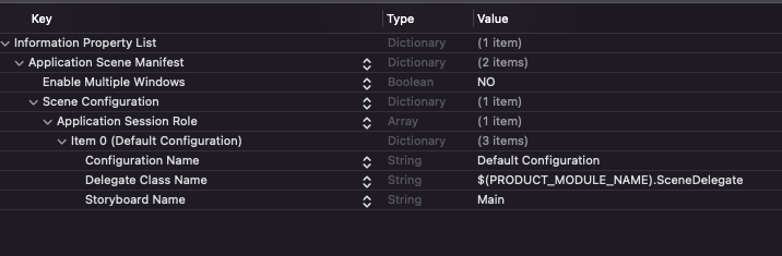 Application Scene Manifest > Scene Configuration > Itm 0 (Default Configuration) > Storyboard Name