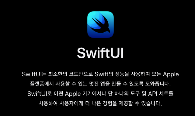 SwiftUI는 Swift의 힘으로 모든 Apple 플랫폼에서 사용자 인터페이스(UI)를 구축 할 수 있는 혁신적이고 특별한(exceptionally) 방법입니다.