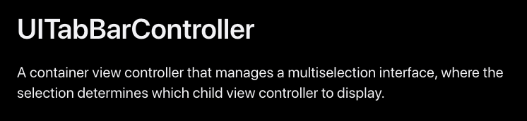 TabBar Controller 는 탭으로 뷰 컨트롤러를 child로 설정하여 관리하는 컨테이너 컨트롤러 입니다.