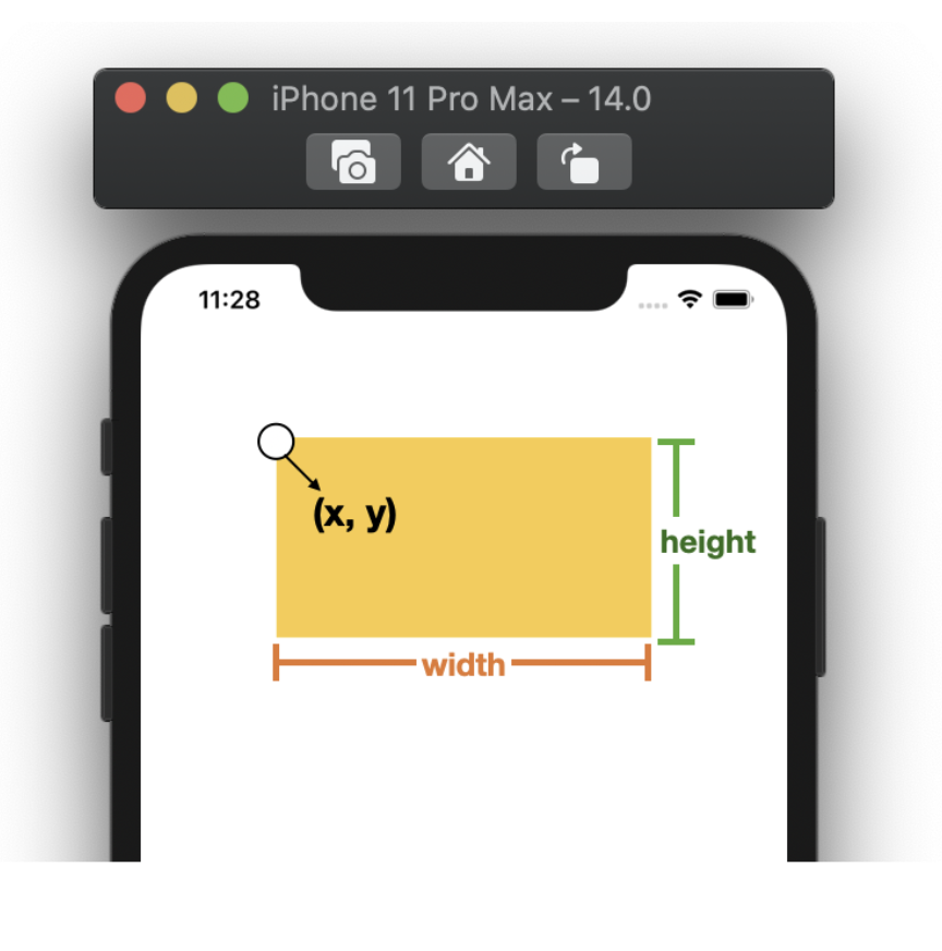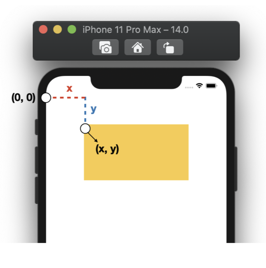 View의 시작 위치를 알기위한 x, y 좌표가 필요하고 이 좌표는 iOS 뷰 기준점인 왼쪽 꼭대기(0,0) 으로부터 시작합니다.