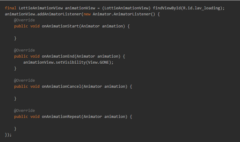 로띠의 애니메이션이 끝난 후에 화면에서 사라지게 하려면 아래의 코드를 참고