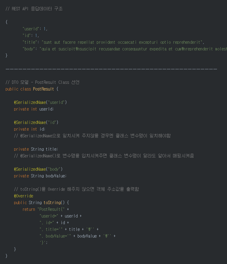 DTO 클래스 안에서 SERIALIZENAME을 하는 이유는 서버에서 변수와 client단의 변수가 이름이 달라도 가져 올 수 있게끔 매칭 시켜주는 어노테이션입니다.