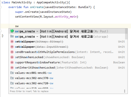 스틱코드를 활용한다면, 클래스에서 'sw'까지만 작성 했을 때 '당겨서 새로고침' 이벤트가 나타납니다.