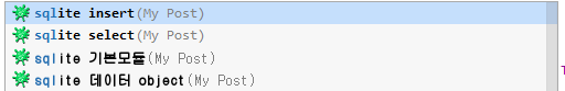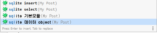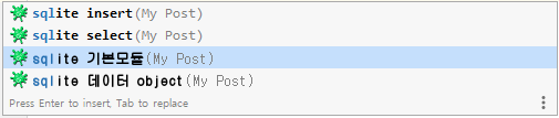 나머지 코드는 sqlite 를 치고 자동완성하실수 있습니다.