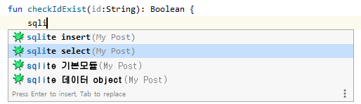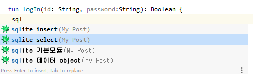 LocalDB.kt 파일내용을 모두 지우고 sqlite 를 입력후 스틱코드를 입력합니다.