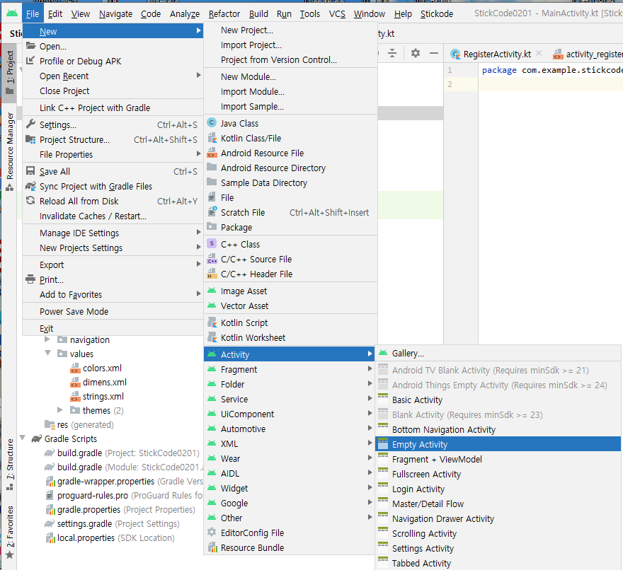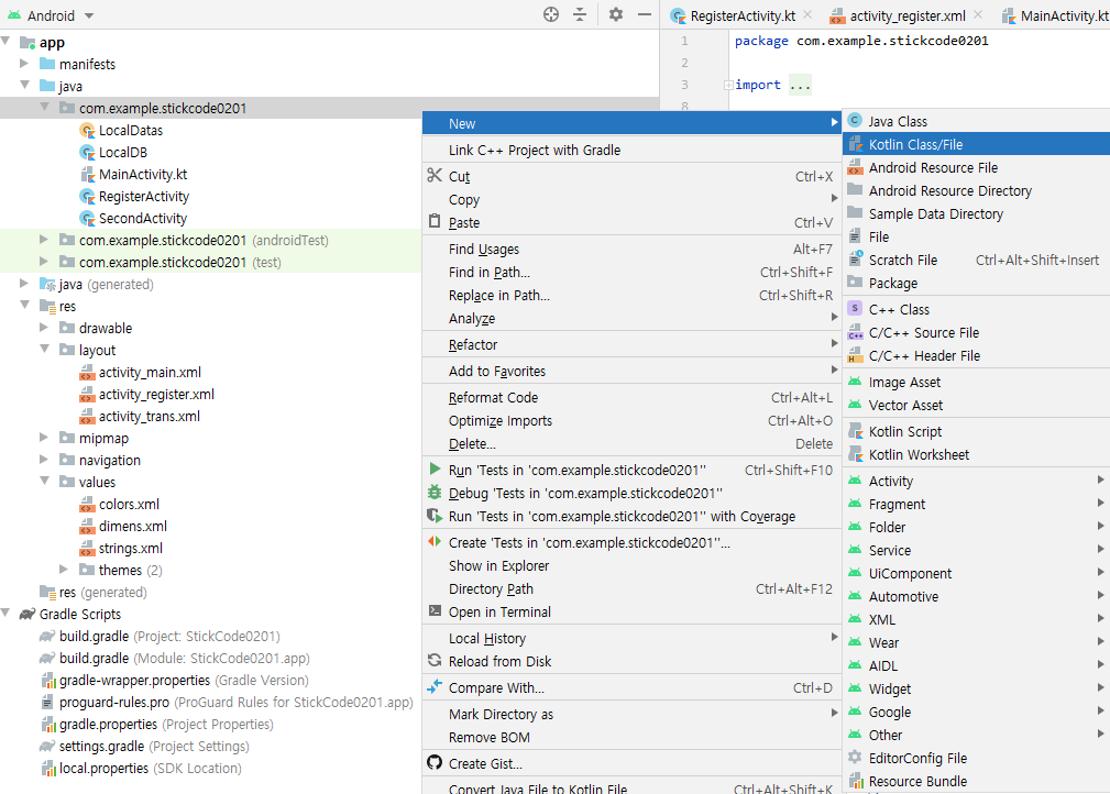 다음과 같이 스틱코드를 입력하면 됩니다. 오류가 뜨는 부분은 제일 위쪽부터 마우스를 올리고 alt+enter를 누르면 전부 사라집니다. RegisterActivity도 마찬가지로 작성해주시면 됩니다.