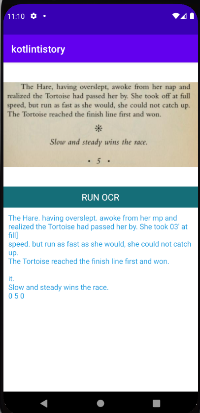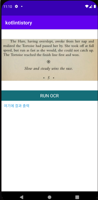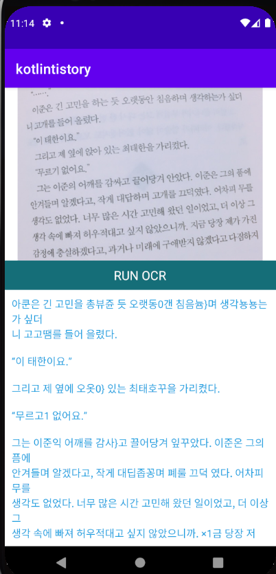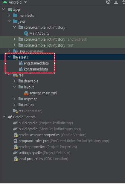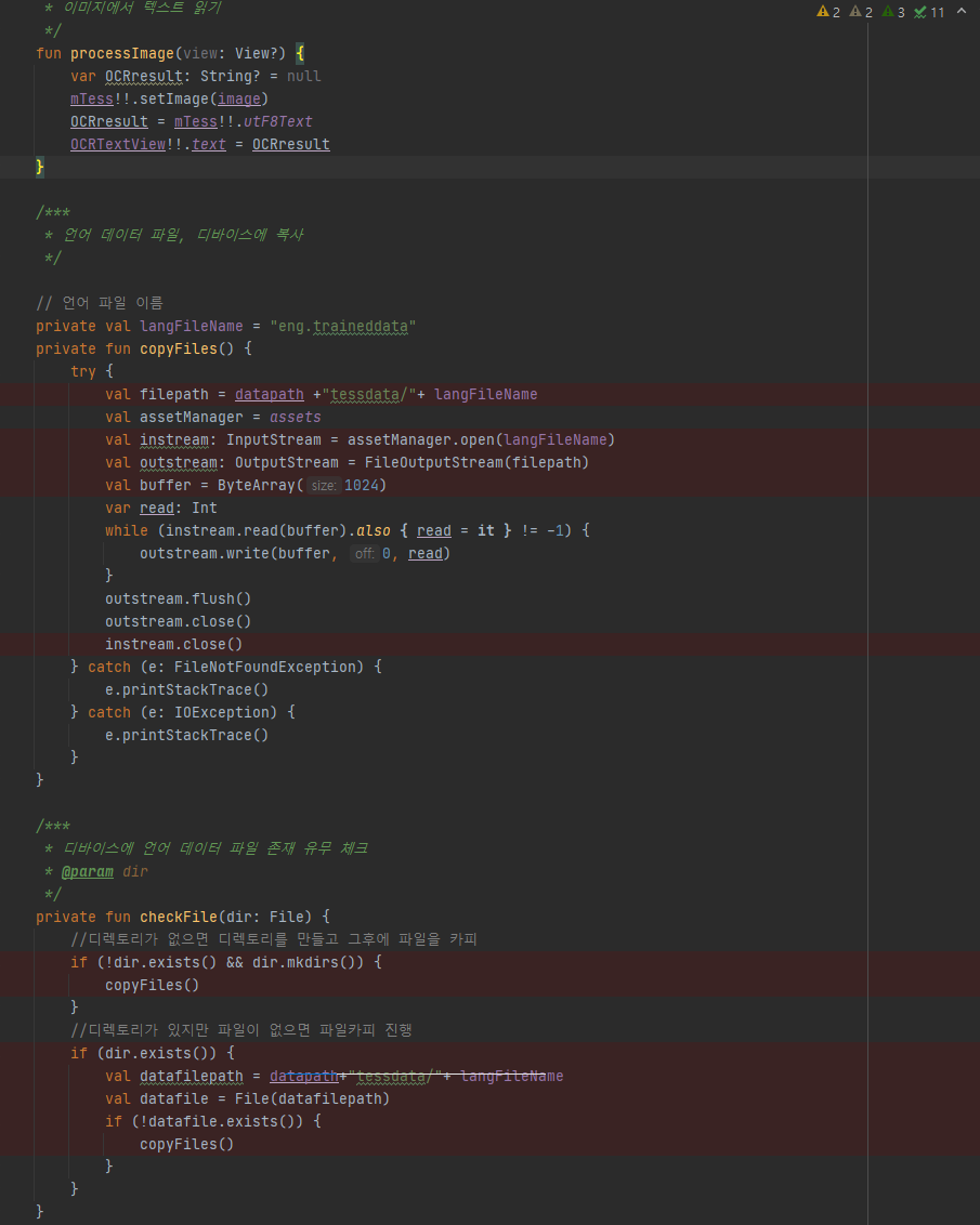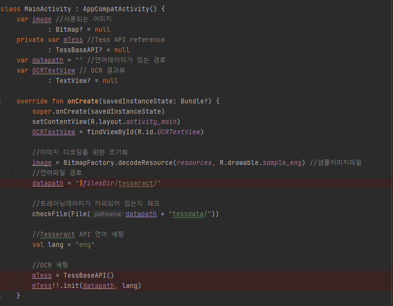 ▶ 필요한 샘플 이미지 파일과 언어 데이터를 OCR 모듈에 세팅해줍니다. 그리고 MainActivity 아래쪽에 스틱코드를 이용해서 OCR 동작 기능을 추가해줍니다.