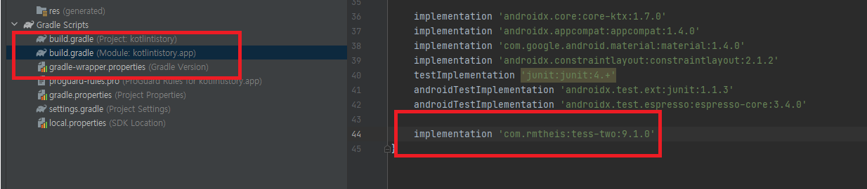 ▶ 해당 기능을 사용하기 위해서는 tess-two라는 모듈이 필요합니다. 위 그림처럼 build.gaddle(moudle) 파일을 열어서 맨 아래 한 줄을 추가하고 동기화시켜줍니다. 최신 버전은 여기서 확인하실 수 있습니다.
