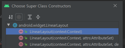 - 맨 윗줄에 빨간 줄이 계시 될 텐데, 커서를 올리고 알트 + enter을 눌러 Create constructor matching super class를 작성합니다. View 생성 시 필수적인 생성자를 만듭니다.