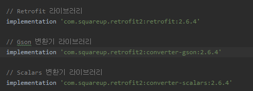 서버에서 보낸 응답 json 데이터를 변환하기 위해 Gson 변환기 라이브러리도 함께 추가해줍니다.