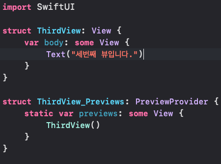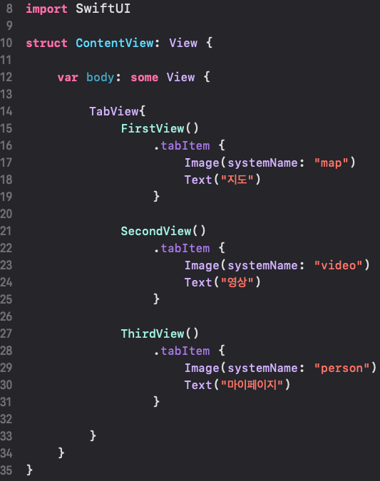 body안에 'TabView{}'를 만들어서, 미리 만들어 놓았던 FirstView ~ ThirdView에다가 각각 .tabItem을 할당해 이미지와 텍스트를 넣어줍니다.