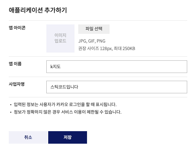앱 아이콘(선택), 앱 이름(필수), 사업자명(필수) 를 설정하고 저장을 누릅니다.