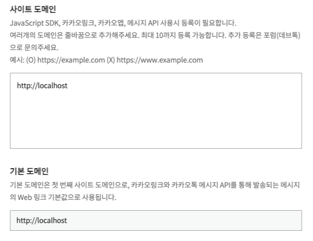 플랫폼 설정하기 - Web 플랫폼 등록 - 사이트 도메인을 등록합니다. (예: http://localhost)