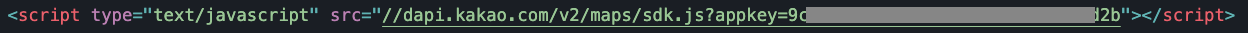먼저 실제 지도를 그리는 Javascript API 를 불러옵니다. 발급받은 앱 키를 아래와 같이 입력합니다.