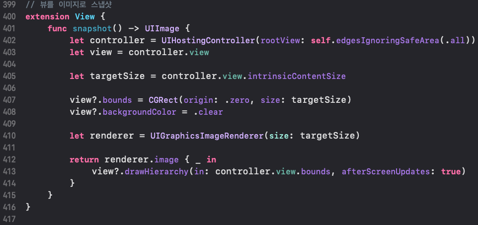 그리고 extension View로 snapshop() 이라는 메서드를 만들어 줍니다.