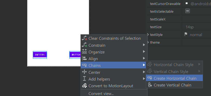 1에서 Horizontal Chain을 채운 채로, 버튼의 Width를 0dp로 조정하면 마치, LinearLayout에서 Weight를 주는 것과 비슷한 효과를 만들 수 있습니다.