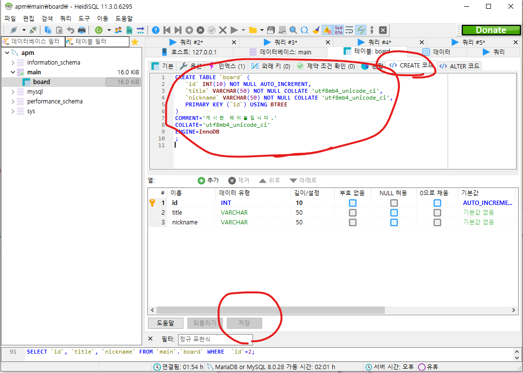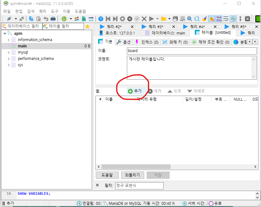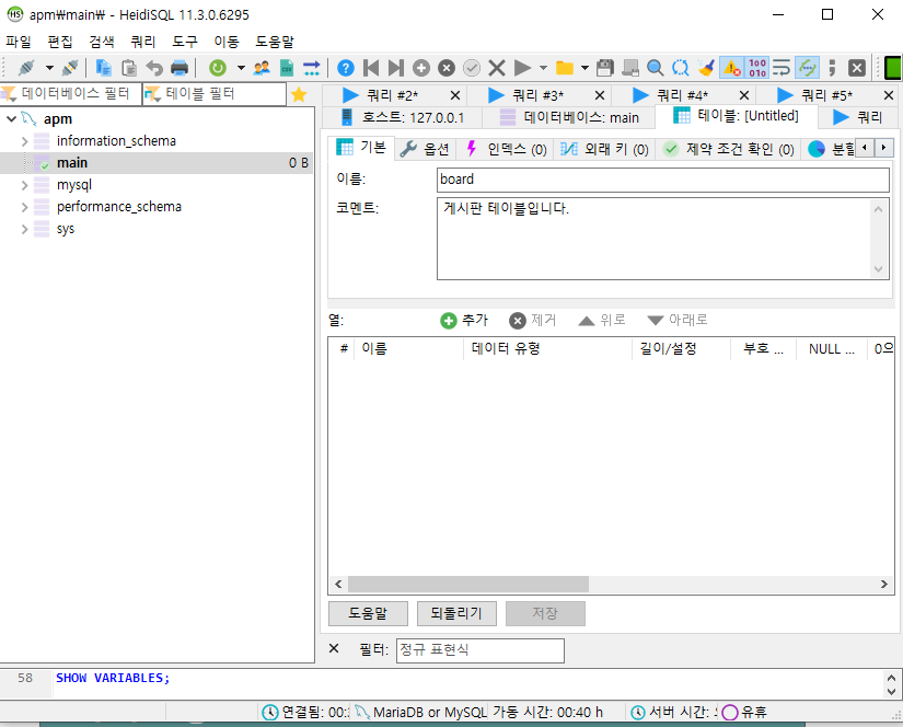 이제 DB 에 들어가서 테이블을 만들고 임시 데이터를 넣어보도록 하겠습니다.