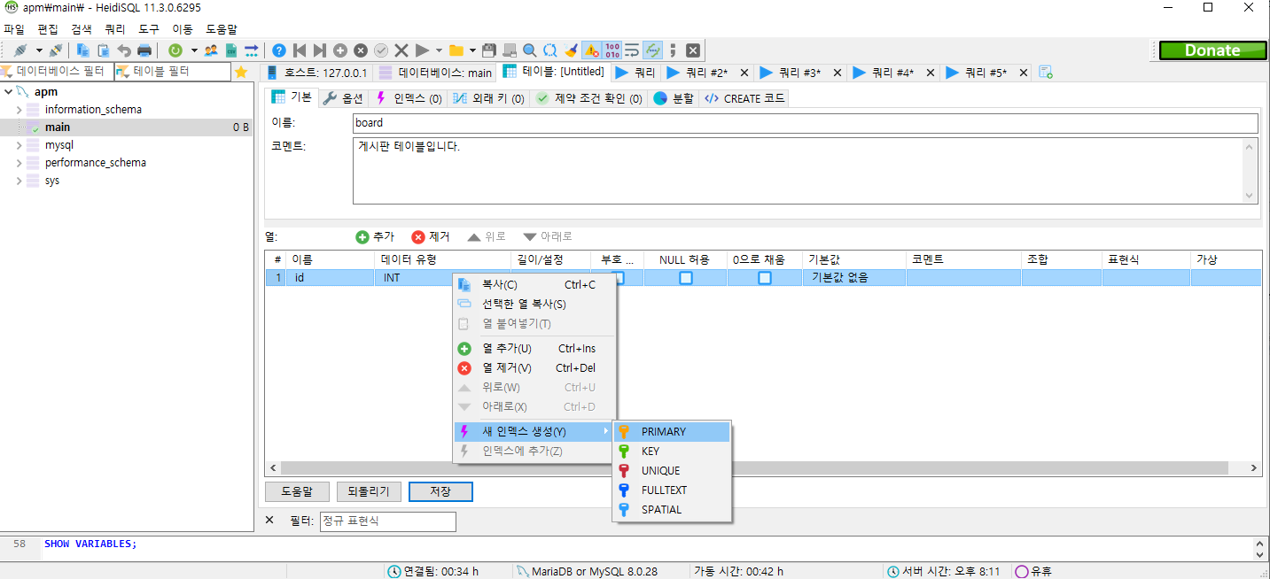 id 칼럼을 하나 추가해주세요. 인덱스도 연결해주세요.