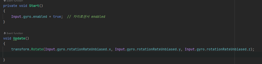 위 스크립트를 3D로 구현된 오브젝트에 적용하고 안드로이드 플래폼에서 빌드를 하면 오브젝트가 스마트폰 센서에 맡게 빙글빙글 돌아가는걸 볼 수 있습니다.