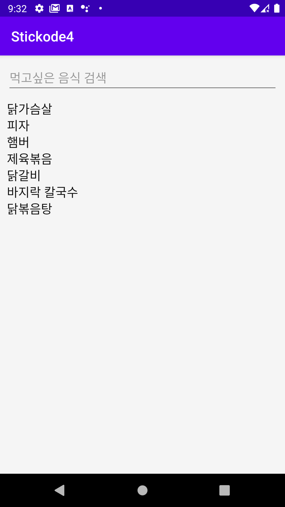 메인 레이아웃에서는 먹고싶은 음식을 검색하는 EditText와 음식 목록을 보여줄 리사이클러뷰가 있습니다.