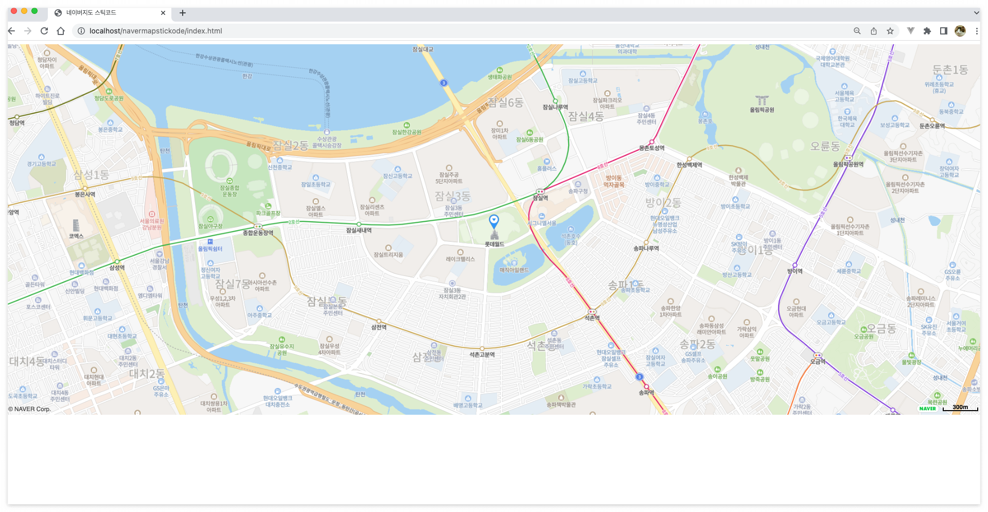 완성된 화면은 다음과 같습니다. 잠실 롯데월드를 중심으로 하는 줌 레벨 15의 지도가 표시되고 롯데월드 위치에 마커도 표시되었습니다.