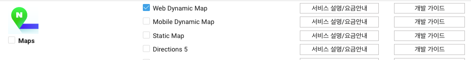 어플리케이션 이름을 입력하고, Maps 중에서 Web Dynamic Map 서비스를 선택합니다.