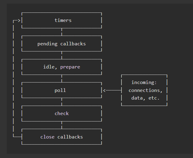 - Node.js가 실행 종료될 때까지 이벤트 처리를 위한 작업을 반복(loop)