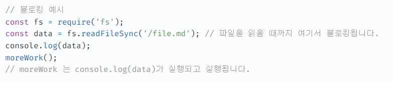 아래의 블로킹 예시에서는 file.md를 다 읽을 때까지 전체 JavaScript 시스템이 멈추지만,