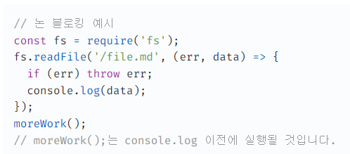 논 블로킹 예시에서는 비동기적으로 실행되기에 전체 JavaScript 시스템이 멈추지 않고 moreWork()가 먼저 실행됩니다. 그리고 file.md를 다 읽고 나서 fs.readFile의 두 번째 파라미터로 들어간 콜백(callback) 함수가 실행됩니다.