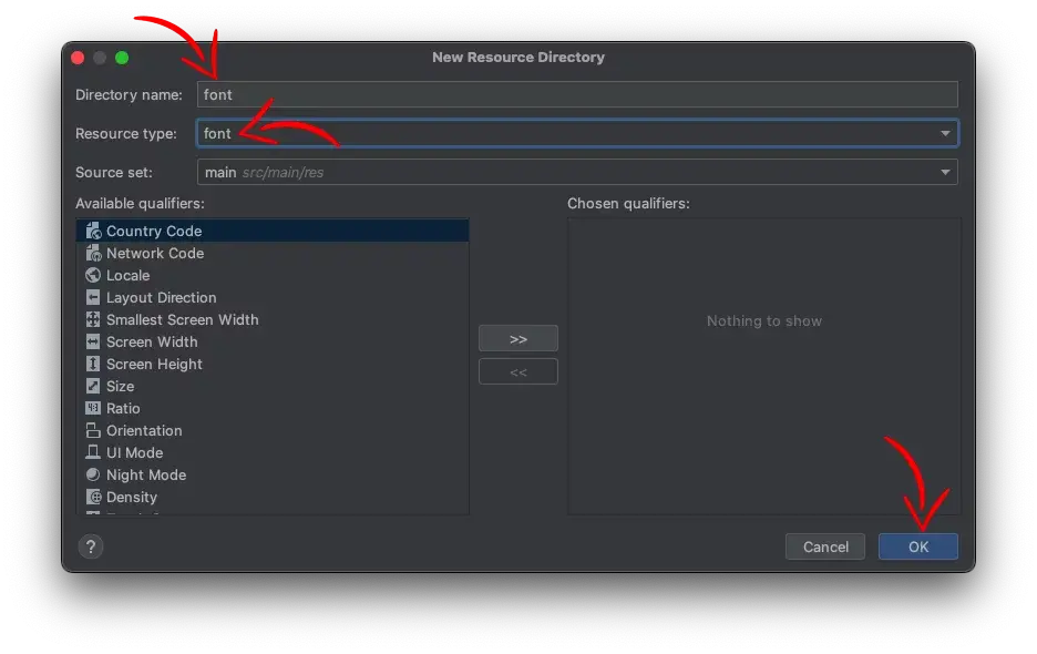 디렉토리 이름은 'font'로 지정하고 리소스타입도 font를 선택합니다.