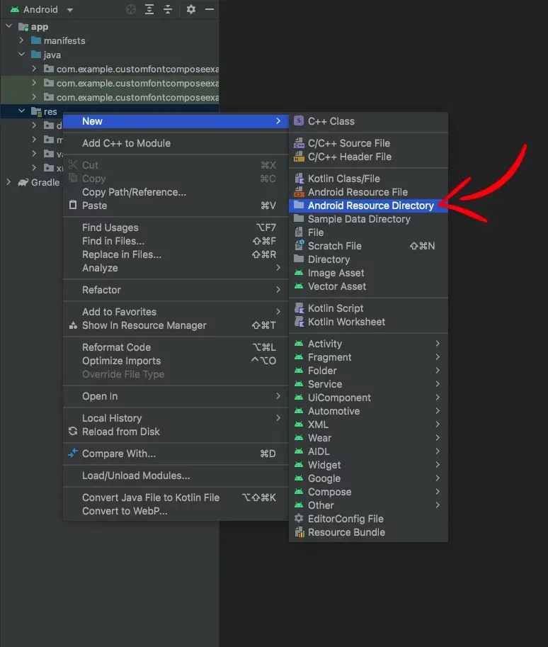 'res' 폴더를 우클릭해서 New > Android Resource Directory 를 클릭합니다.