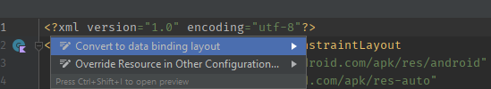 - activity_main.xml 의 최상단의 <?xml…?> 부근 왼쪽 가장자리를 클릭하면 전구가 표시되고 (또는 Alt+Enter 누름) "convert to data binding layout"을 클릭합니다. (직접 레이아웃의 가장 바깥을 <layout></layout> 으로 감싸도 됩니다.)