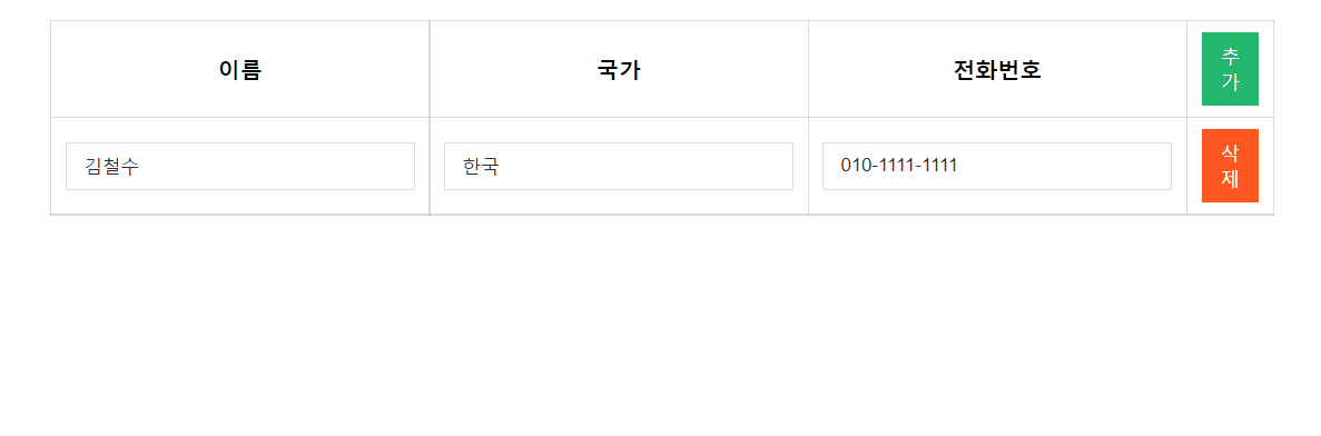 우선 html에서 테이블을 만들어보겠습니다. 각 버튼에는 onClick으로 각각 추가/삭제 이벤트를 주었습니다.