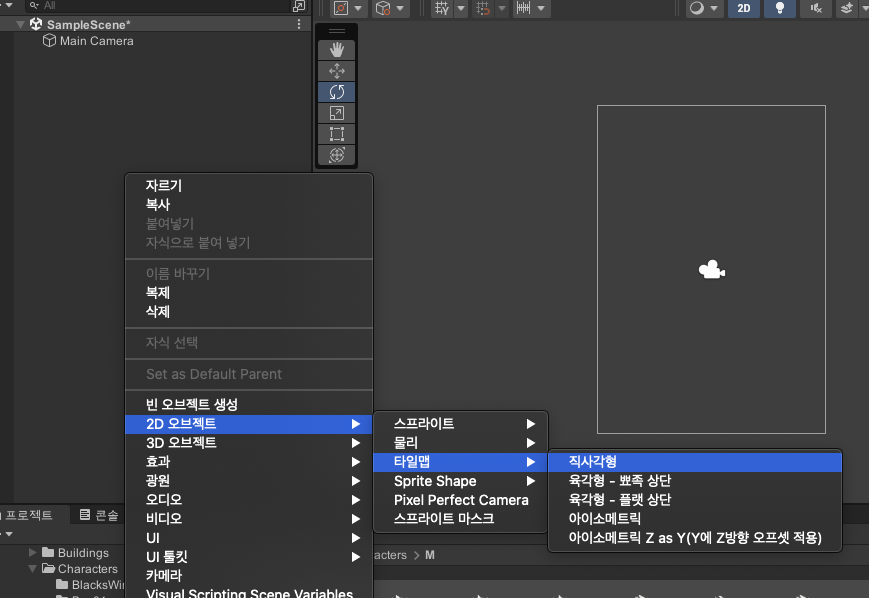 먼저 계층구조에서 2D 오브젝트 - 타일맵 - 직사각형을 생성합니다.