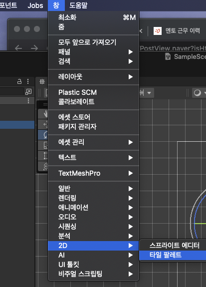 상단의 메뉴에서 Window - 2D - 타일팔레트를 선택합니다.