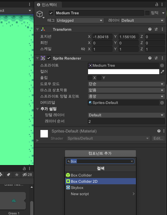 추가적으로 나무에 BoxCollider2D 컴포넌트를 추가했지만 그대로 통과가 되는 경우에는 캐릭터에 BoxCollider2D가 없는 경우일 수 있습니다.