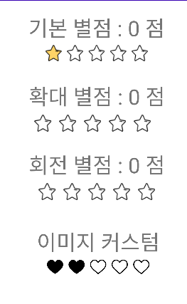 ratingBar.setStepSize(0.5f); // 한번에 몇 점씩 오를지 설정